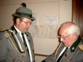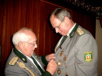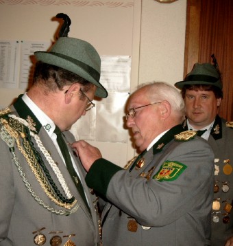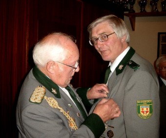 Vorjahreskaiserwanderpokalsieger Bernd Cloppenburg erhält vom Kaiser den Gewinner- und Verdienstorden für das Kaiserwanderpokalschießen 2003/2004 Im Hintergrund Bernhard Willer (2. Vorsitzender), der die Siegerehrung begleitete. |